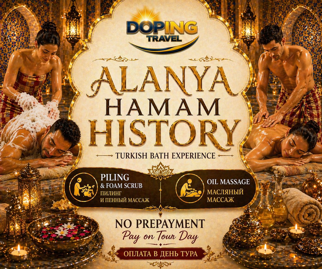 Das Hamam und wellness in Alanya ist ein schönes Beispiel osmanischer Kultur. „Türkisches Bad“ bedeutet aus dem Türkischen übersetzt „Hammam“. Dies ist der beste Weg, um schneller braun zu werden, Stress und Müdigkeit abzubauen und eine wunderbare Hautpflege zu erhalten. Das Reisebüro Alanya Tours lädt Sie ein, eines der besten wellness in Alanya zu probieren. Alanya Hamam ist nicht nur das traditionelle Bad der Prinzessin Kleopatra oder der berühmten Sultane, sondern auch Schaummassagen, Körpermassage, Hautpeeling (hamam waschlappen), Spa, Sauna, Dampfbad, Salzgrotte und vieles mehr. Die Kosten für den Besuch eines türkischen Hamams variieren, aber bei uns können Sie eine tolle Option wie das Alanya-Hammam zu einem erschwinglichen Preis buchen. Wir bieten bequeme Transfers von Hotels in Mahmutlar, Konakli, Avsallar, Turkler, Incekum, Kargicak und Okurcalar an. Buchen Sie ein Hamam in Ihrer Nähe und entspannen Sie sich. Finden Sie heraus, was Sie mitbringen sollten und was ein Hamam in der Türkei ist. Massage und Hamam in Alanya warten auf Sie!