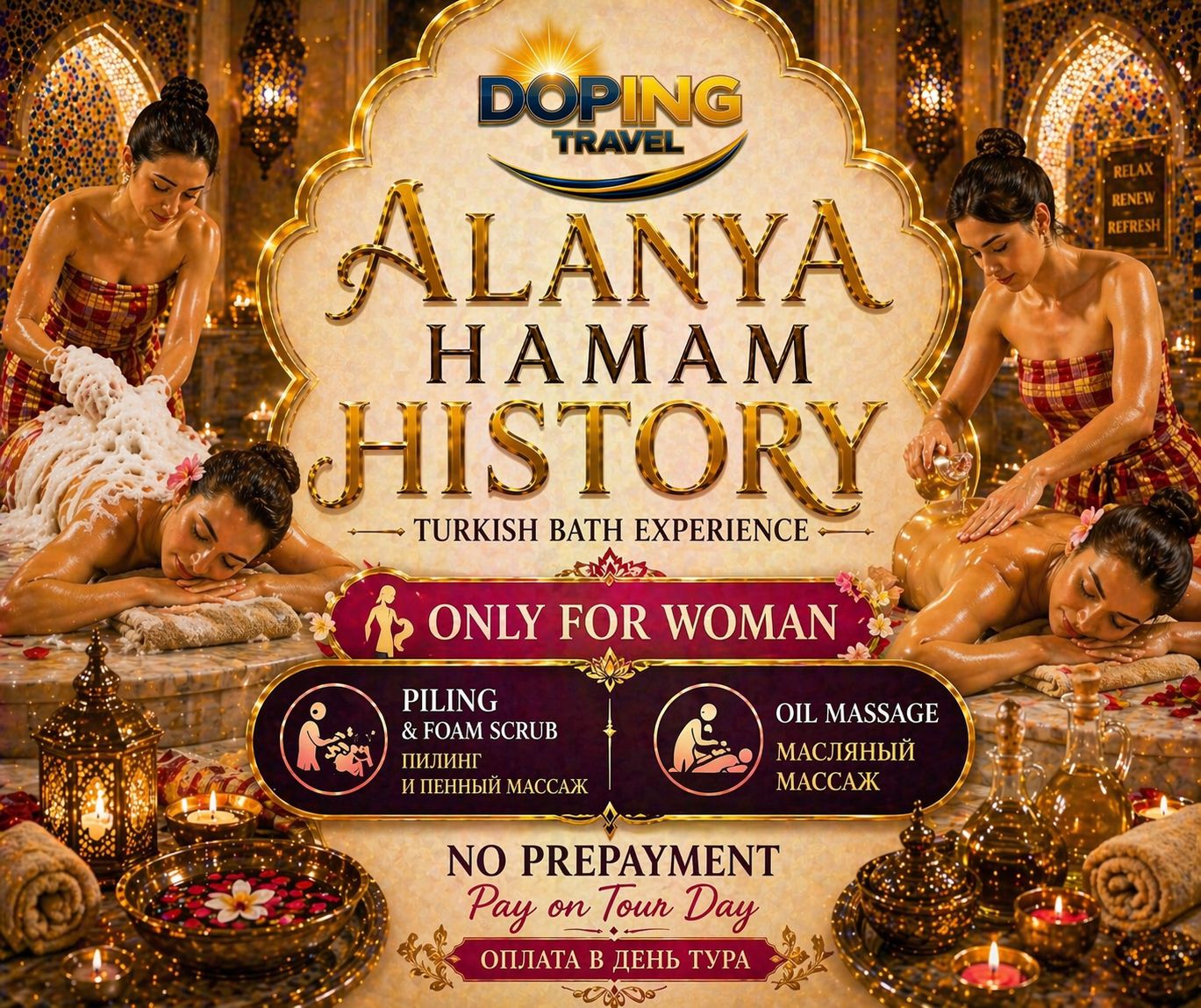 Hamam und wellness in Alanya – Ein wunderbarer Zeitvertreib in der Türkei ist die Türkische Badtour in Alanya. Ein Hamam ist ein türkisches Bad, dessen Besuch zu einem besonderen Ritual wird. Hier entspannen Sie nicht nur mit dem ganzen Körper, sondern auch mit der Seele. Die Einwohner der Türkei ehren dieses Ritual heilig und freuen sich, Gästen einen so erstaunlichen Ort vorstellen zu können. Nach einem Besuch im türkischen Bad werden Sie alle weltlichen Probleme vergessen und überirdische Freuden erleben.