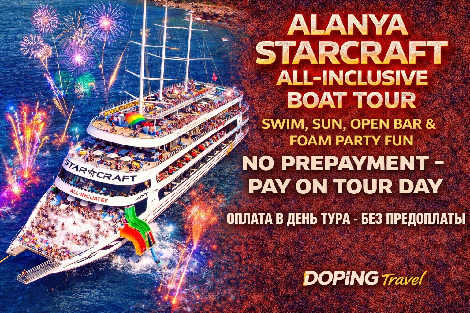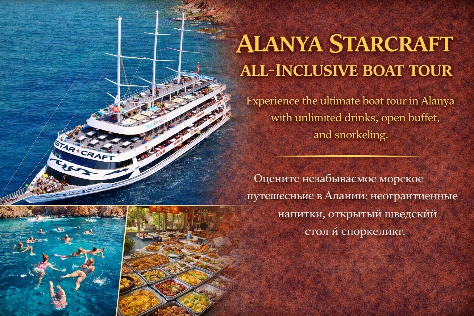 Проведите яркий день на самом большом пиратском корабле Алании – Starcraft! В программе – живая музыка от DJ, пенные вечеринки, купание в лазурных бухтах, посещение пещер, шоу-анимация и обед. Отличный выбор для тех, кто хочет совместить отдых на море с весельем.